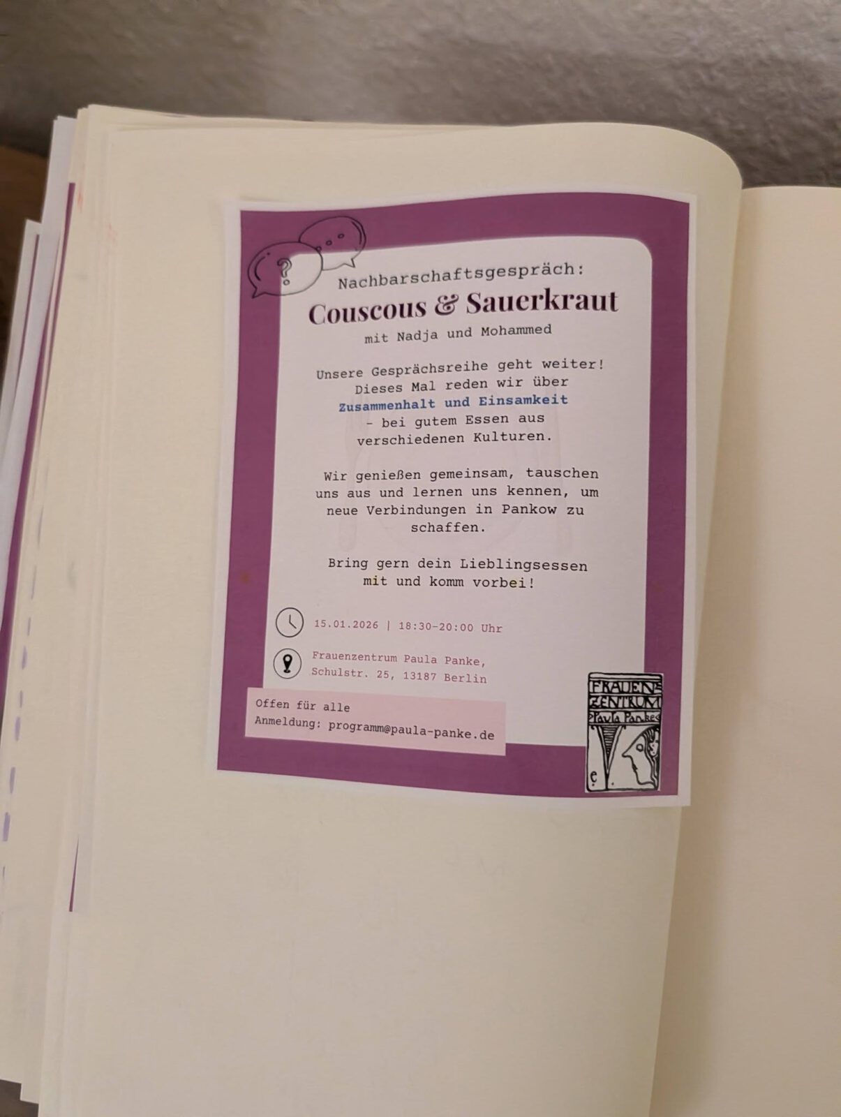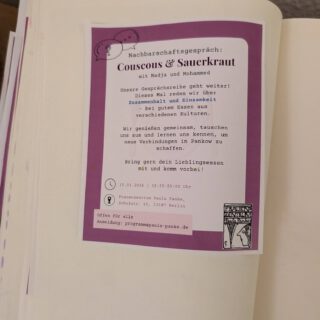 „Couscous & Sauerkraut“ ist ein offenes Dialogprojekt im Bezirk Pankow. Es bringt Menschen mit und ohne Migrationsgeschichte an einen Tisch, um miteinander zu essen, zu sprechen und einander zuzuhören.