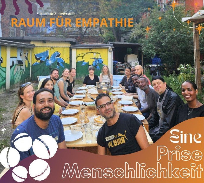 Das Projekt Eine Prise Menschlichkeit (01.06.2023-31.05.2026) ermöglicht es Menschen mit und ohne Fluchterfahrung sich in Begegnungsevents rund um das Thema Kochen auf Augenhöhe zu treffen. Das Projekt wurde gestartet, um Einsamkeit und Ausgrenzung durch persönliche Begegnungen und gemeinsame Aktivitäten entgegenzuwirken. So schaffen wir gelebte soziale Teilhabe und stärken lokales Engagement für eine solidarische und offene Gesellschaft. Das Projekt bietet diverse Partizipationsmöglichkeiten von besonders niederschwellig (z. B. Einbringen eigener Rezepte) bis hin zur Umsetzung von Veranstaltungen. Damit fördern wir Selbstwirksamkeit und bieten sinnstiftende Engagementmöglichkeiten. Wir schaffen Räume der Begegnung für alle Altersgruppen und stärken das Verständnis zwischen verschiedenen Gruppen in der Gesellschaft. Teilnehmende werden eingeladen, die eigene Rolle zu reflektieren und sich kritisch mit sich und ihrer Umgebung auseinanderzusetzen. Projektaktivitäten werden dabei von Ehrenamtlichen aus den Communities organisiert und umgesetzt und von Hauptamtlichen unterstützt.