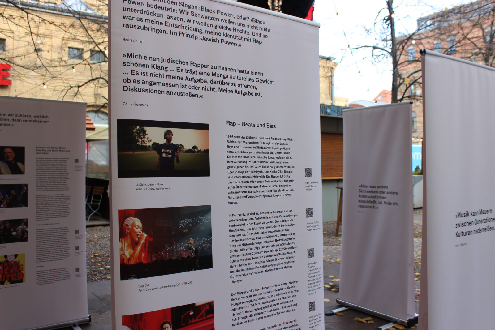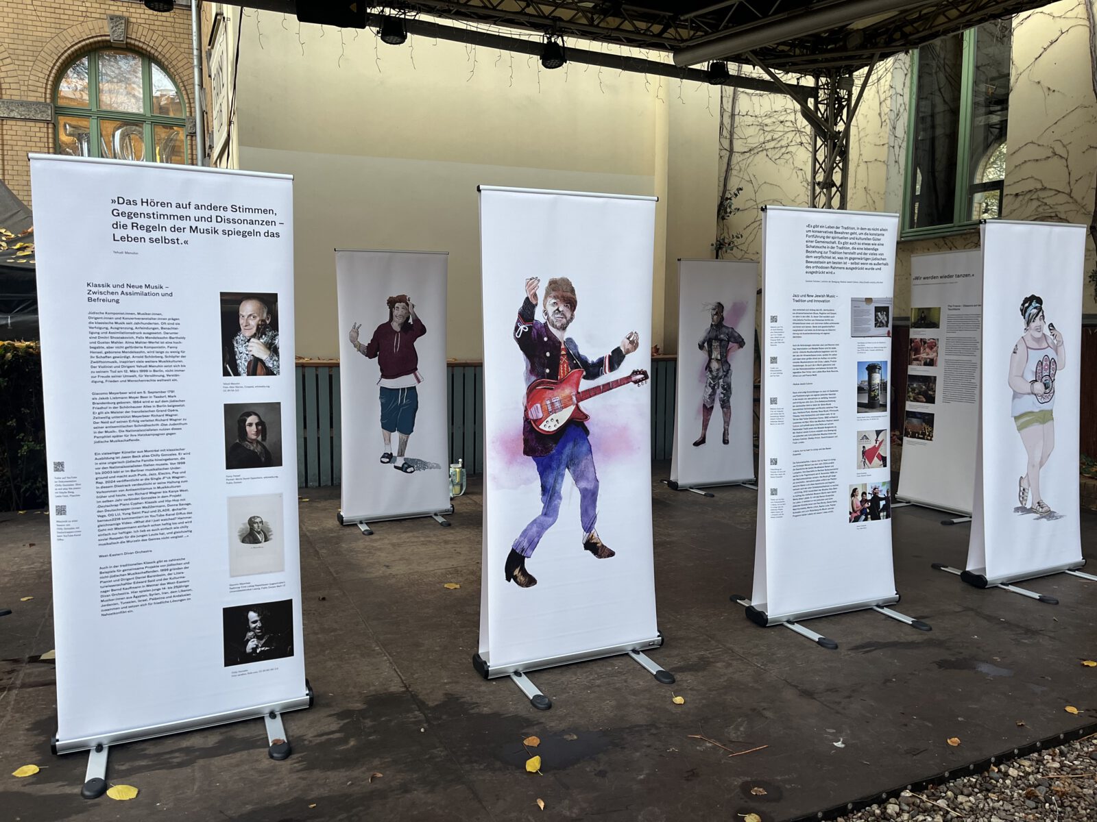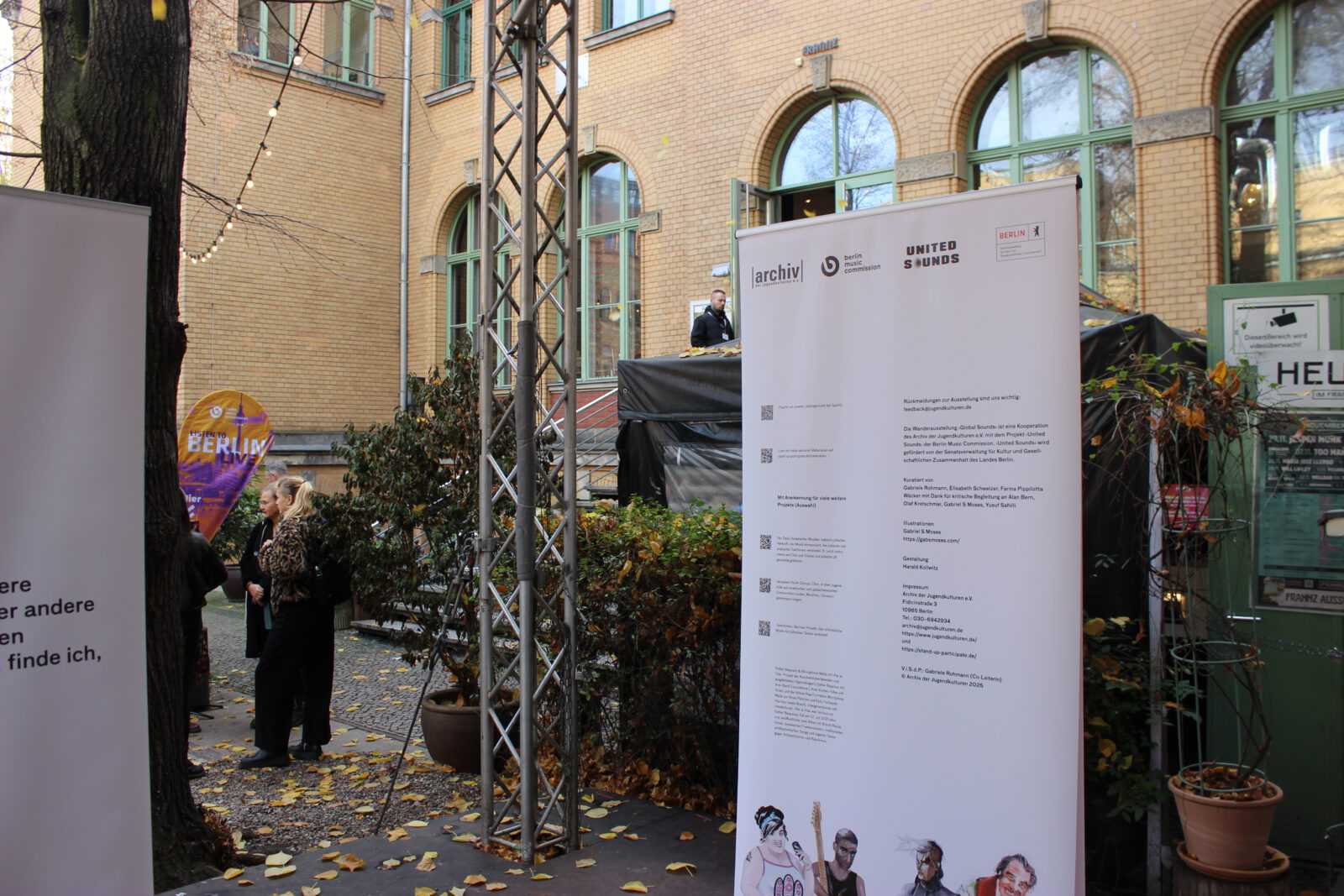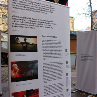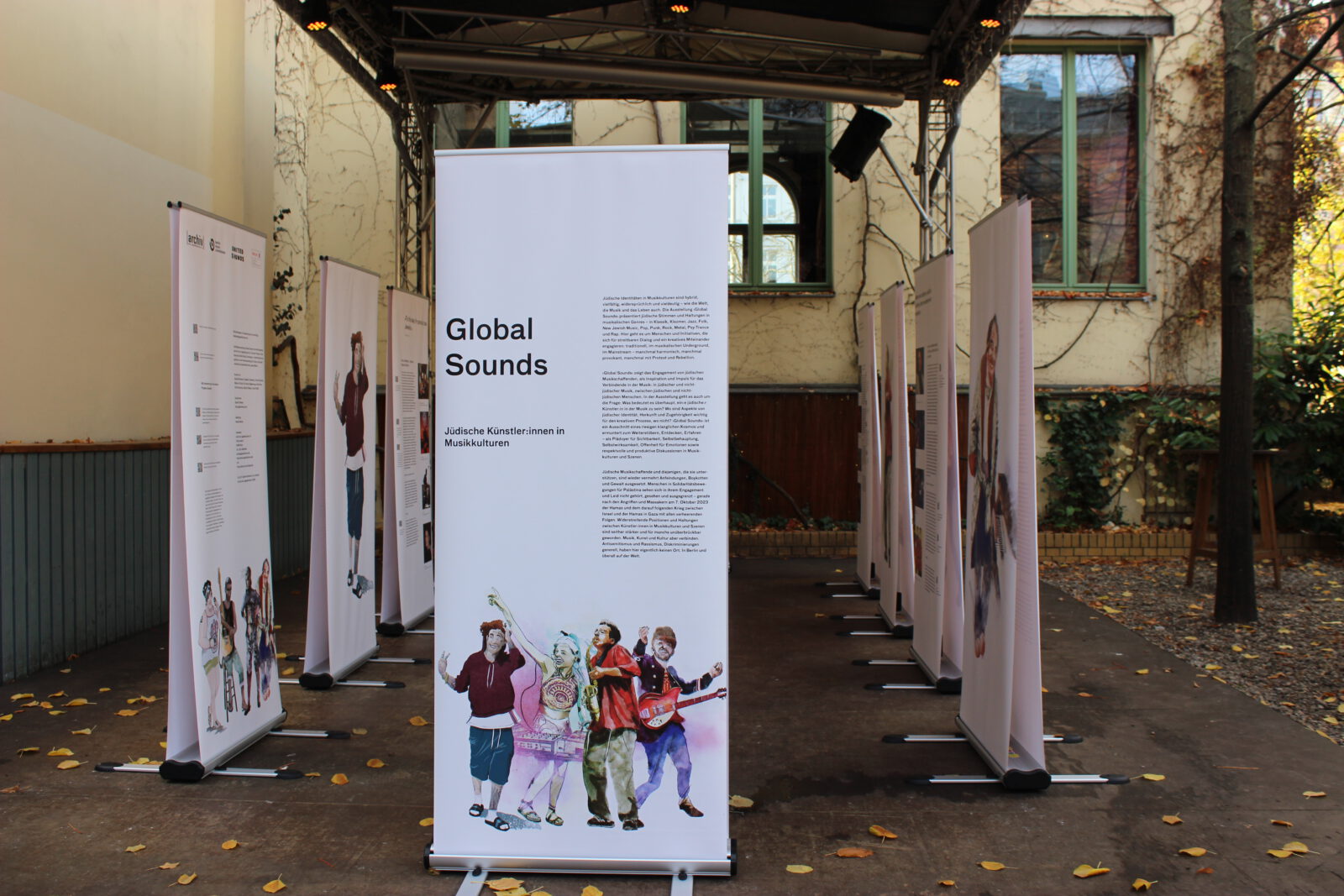 Seit dem Massaker der Hamas in Israel am 7. Oktober 2023, den Geiselnahmen und dem Krieg in Gaza sind weltweit Antisemitismus und der Hass auf den Staat Israel massiv angestiegen. Dies zeigt sich auch in Berlin. Viele Menschen, Initiativen, Veranstaltungsstätten, Vereine und Verbände, die sich solidarisch mit Israelis und Juden und Jüdinnen hier zeigen, sind Anfeindungen, Ausgrenzungen, Boykottaufrufen, Bedrohungen und Angriffen ausgesetzt. Auch in der Clubkultur ist es seither zu scharfen Auseinandersetzungen und Polarisierungen gekommen. Mit unserer Wanderausstellung „Global Sounds“ möchten wir dem etwas entgegen setzen und machen jüdische Künstler:innen in Klassik, Klezmer, Neuer jüdischer Musik, Balkan Pop, Jazz, Pop, Metal, Punk, Rock, Techno und Deutschrap sichtbar, die sich mit Identitäten, jüdischen Positionen, jüdischer Musik und Jüd:innen in der Musik – teilweise mit deutlichen Bezügen zu Berlin – auseinandersetzen und sich in vielfältigem Engagement für ein friedliches Miteinander einsetzen. Die Ausstellung besteht aus 10 doppelseitigen Outdoor-Rollups mit Zitaten, Illustrationen, Fotos, Bildern, QR-Codes zu Dokumentationen, Musik, Interviews, Fachartikeln, Projekten und einer Playlist. Sie konnte dank einer Kooperation mit der Berlin Music Commission (BMC) in deren Projekt „United Sounds“ vom Archiv der Jugendkulturen in einem interkulturellen und interdisziplinären Team kuratiert und realisiert und erstmalig im November 2025 auf der Most Wanted Music Conference der BMC in der Kulturbrauerei Prenzlauer Berg mehreren tausend Besucher:innen präsentiert werden. Seither wird sie vom Archiv der Jugendkulturen ehrenamtlich ohne finanzielle Förderung oder Unterstützung weiter aufrechterhalten und kann in öffentlichen und nicht-öffentlichen Räumen in Innen- und in Außenbereichen gezeigt werden.