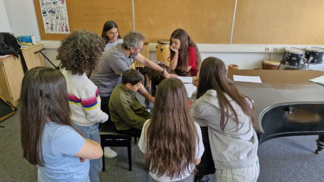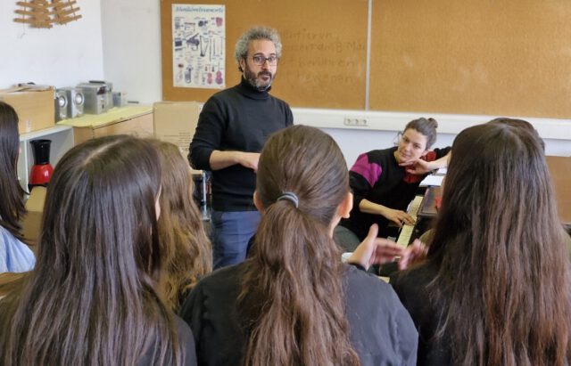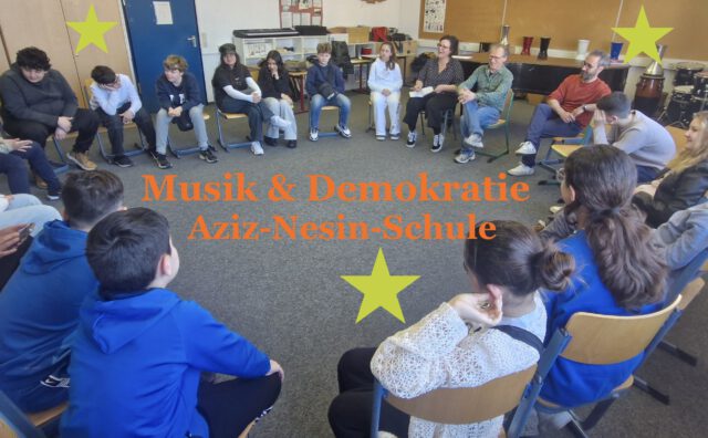 Vom ersten Workshop an wurde gemeinsam musiziert, was extrem wichtig war, denn die Atmosphäre bei Gesprächen über Ungerechtigkeit und undemokratische Situationen weltweit war manchmal schwer. Darüber hinweg halfen Musikspiele, Singen und Klatschen im Rhythmus eines kurdischen Liedes, das der syrische Gastmusiker Renas Ibrahim mitbrachte. Dabei stand nicht der/die Einzelne im Mittelpunkt, sondern die Gruppe, um etwas gemeinsam zu erschaffen. „Manche sind talentierter als andere, aber wir müssen es schaffen, zusammen gut zu klingen“ vermittelt Evi Filippou. „Sehr demokratisch!“, sagt lachend die Fachlehrerin, wie die junge Jazz-Musikerin berichtet.