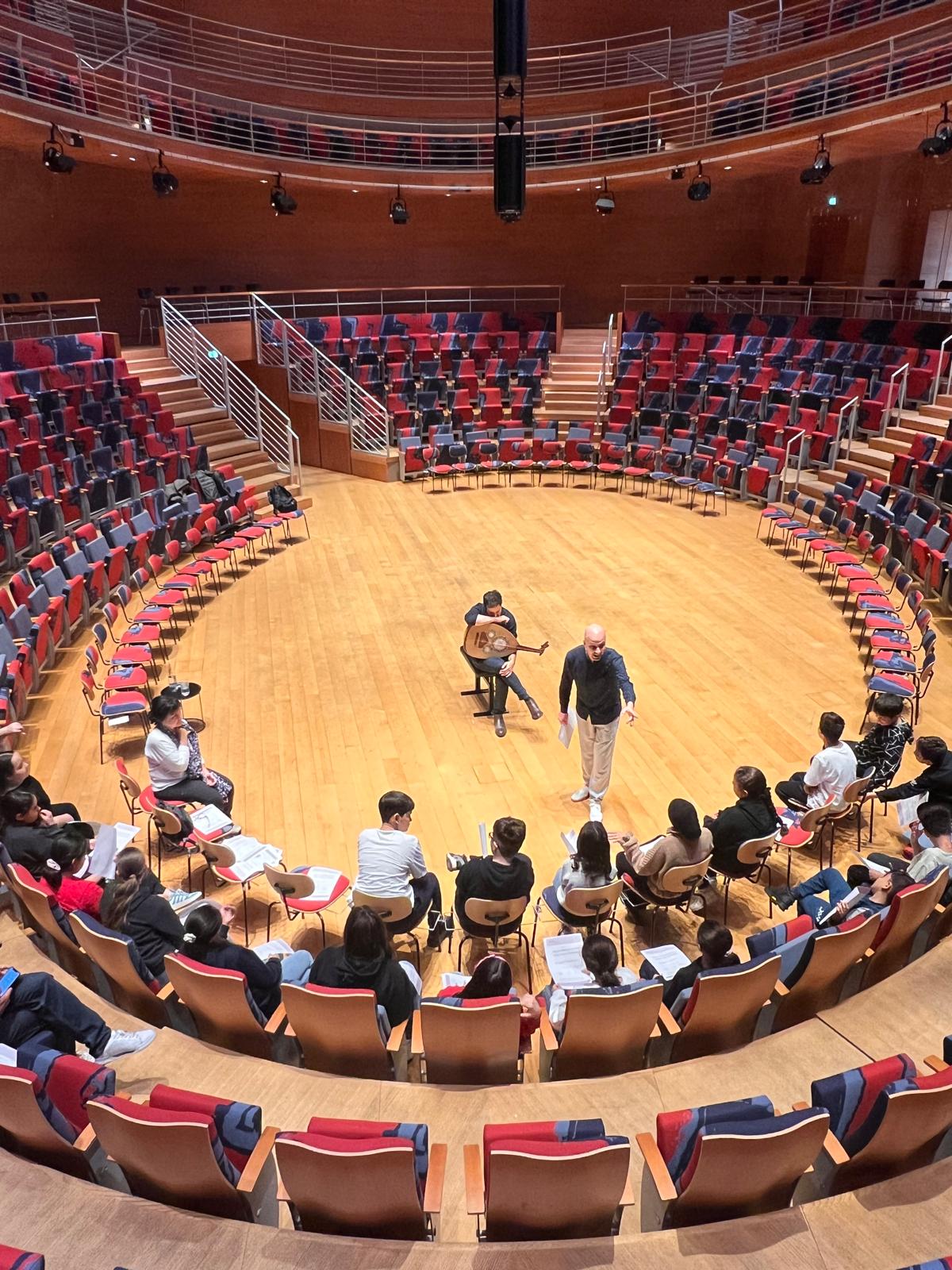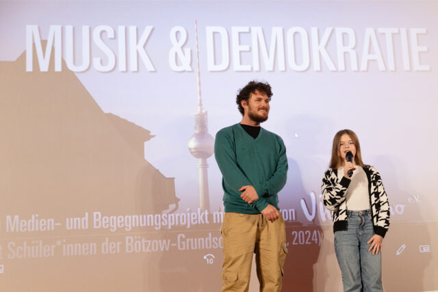 Rund 50 Kids der Bötzow-Grundschule erforschten wie Musik demokratische Werte fördern kann zusammen mit der griechischen Jazz-Musikerin Evi Filippou, dem syrischen Fagottspieler Ahmad Qafour, dem südafrikanischen Musiker und Filmemacher Joseph Weinberg, der israelischen Cellistin Illay Chester und dem Berliner Geschichtenerzähler und Mandolinenspieler Sven Tjaben.