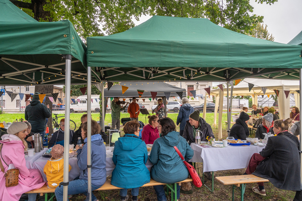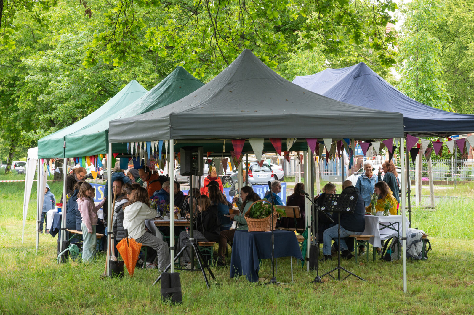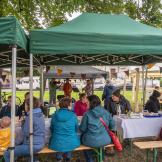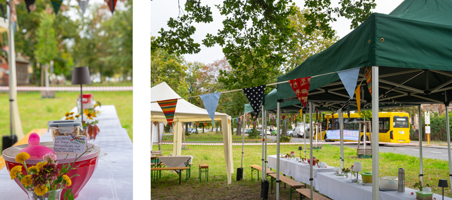 Wir stellten die nötigen Anträge und hatten Glück, dass sie so bewilligt wurden, dass wir unser Vorhaben umsetzen konnten. Dann mähten wir die Rasenfläche auf dem Anger, stellen als Schutz vor Regen Pavillons auf, die uns die Albert Schweitzer Stiftung – Wohnen & Betreuen zur Verfügung gestellt hat. Die Bierbänke liehen wir uns von der Ev. Kirchengemeinde Blankenburg, Danke für diese Unterstützung!