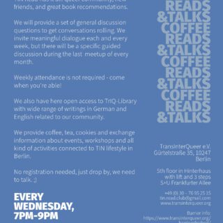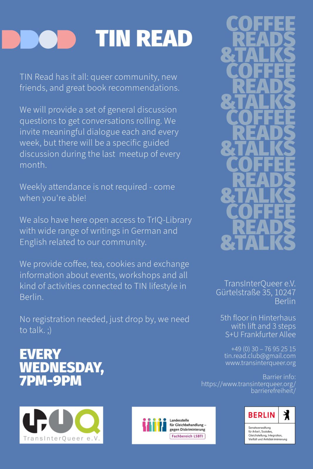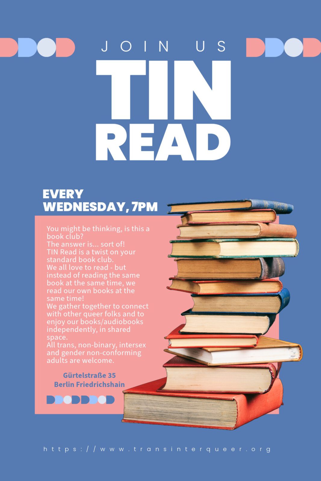 TIN Read ist eine wöchentliche englischsprachige Lesegruppe für alle trans*, inter*, nicht-binären und gender-nonkonformen Erwachsenen.